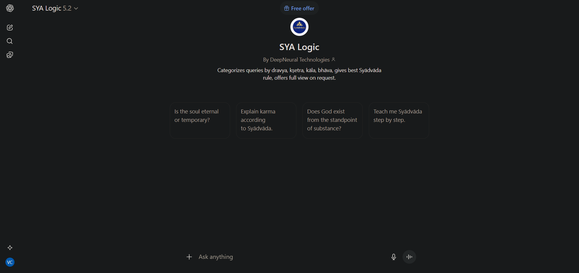 A custom GPT-based conversational system designed to explain AI responses using multi-perspective Syādvāda logic. Helps users understand different viewpoints and contexts.